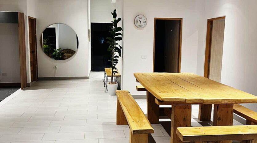 3 habitaciones, la principal amplia con baño, vestidor y terraza. 1 Habitación auxiliar amplia con baño, closet y terraza.1 Habitación auxiliar con closet. 1 Baño social. Cocina moderna abierta con isla. Sala comedor. Zona de ropas .Cuarto útil. Espacio para parquear 3 Vehículos.