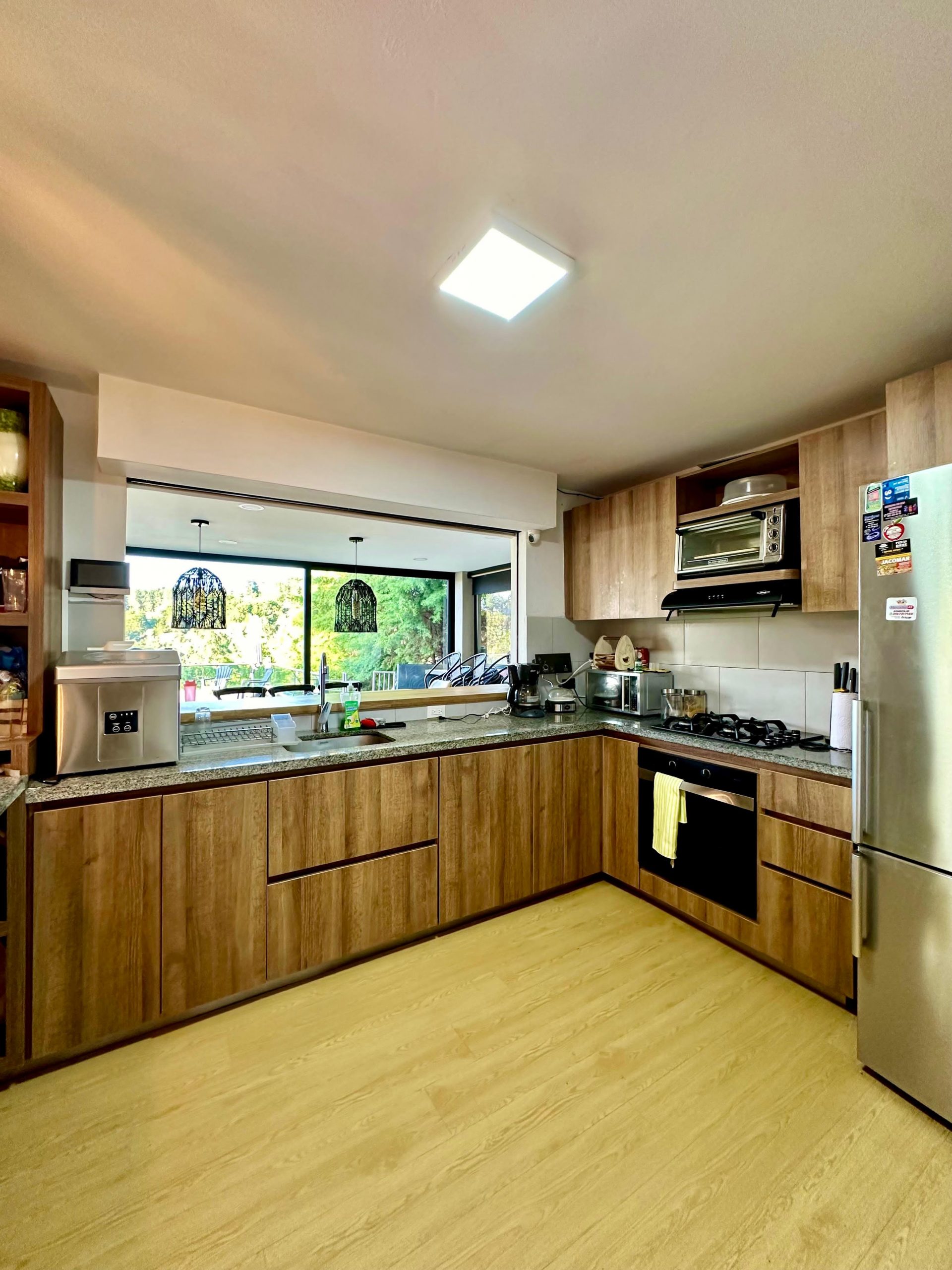Cocina , zona de ropas, zona social con bar, sala y comedor.
